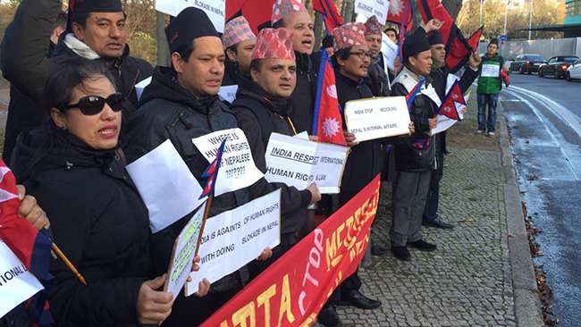 नाकाबन्दीको विरोधमा बर्लिनमा भारतीय दूताबास अगाडि नेपालीहरूको प्रर्दशन